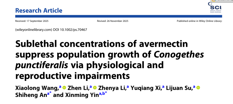 尹新明教授/安世恒教授团队在昆虫学中科院一区TOP期刊《Pest Management Science》杂志在线发表了题为“Sublethal concentrations of avermectin suppress population growth of Conogethes punctiferalis via physiological and reproductive impairments”的研究论文。该研究系统评估了阿维菌素对桃蛀螟在繁殖能力、激素调控、解毒代谢及种群动态发生等多个方面的影响,为桃蛀螟的可持续综合防控提供了重要科学依据。