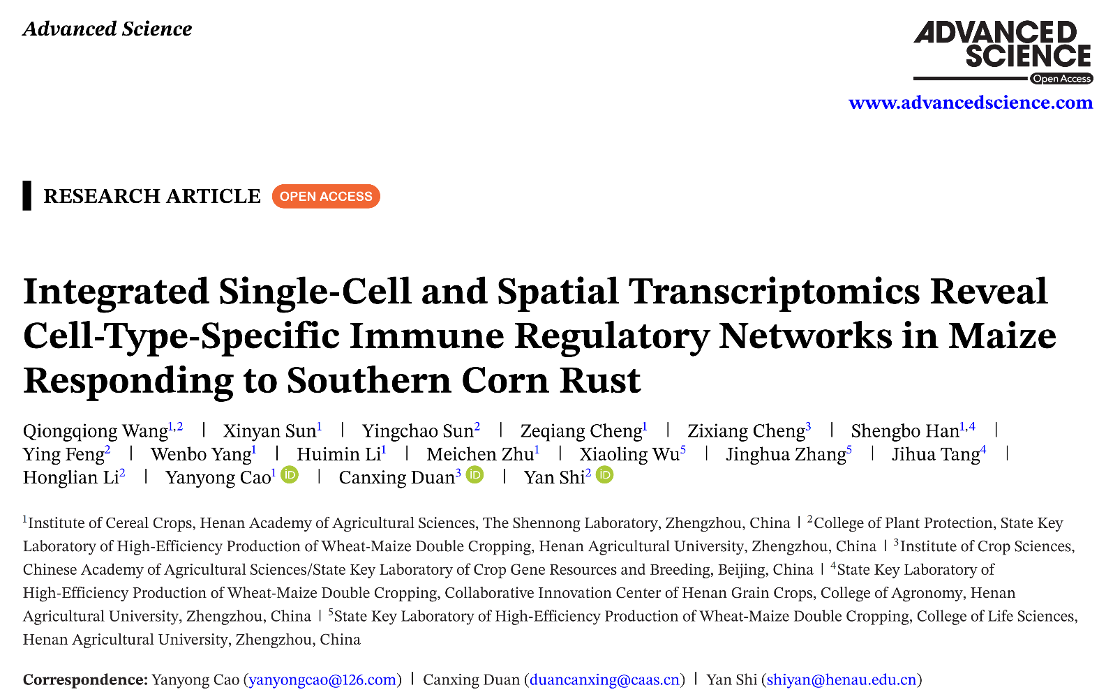 李洪连教授团队施艳教授课题组联合河南省农业科学院粮食作物研究所曹言勇团队、中国农业科学院作物科学研究所段灿星团队在《Advanced Science》期刊发表“Integrated Single-Cell and Spatial Transcriptomics Reveal Cell-type-specific Immune Regulatory Networks in Maize Responding to Southern Corn Rust”的研究性文章,主要构建了玉米应答南方锈病侵染早期的高分辨率时空转录图谱。