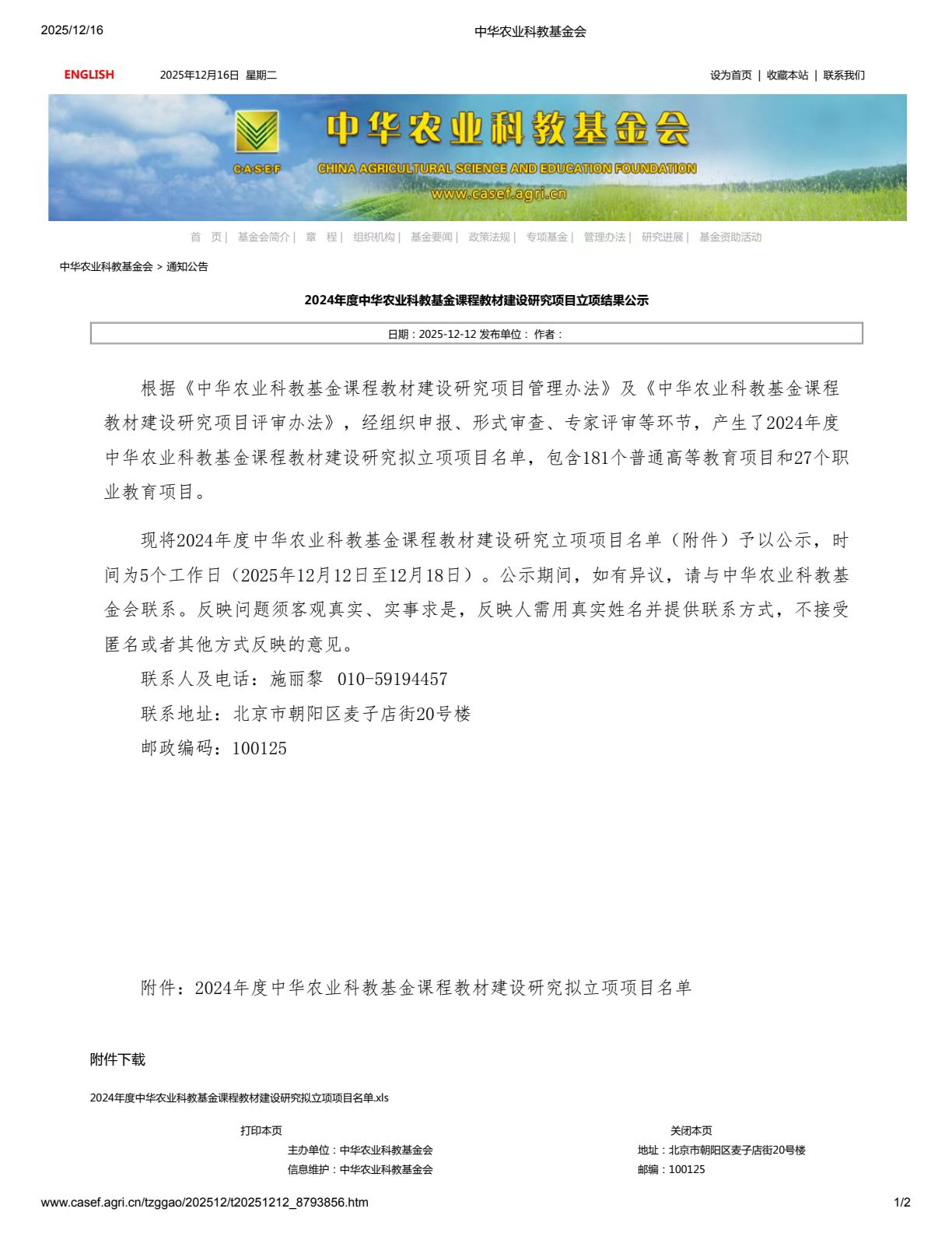 中华农业科教基金课程教材建设研究项目旨在深入贯彻党的二十大精神,紧密围绕教育强国和农业强国建设目标,充分调动广大教师和教学管理人员的积极性,深化教学改革与教学研究实践,总结、凝练和探索高等农业教育课程教材建设经验与规律,为构建高水平课程教材体系、服务高质量涉农人才培养提供支撑。
