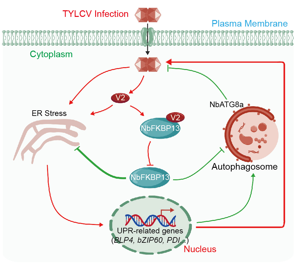 研究发现,TYLCV侵染及其编码的V2蛋白均可激活寄主UPR通路,且UPR的激活利于病毒侵染。进一步研究表明,V2与蛋白折叠过程中的重要限速酶NbFKBP13直接互作,并改变NbFKBP13的亚细胞定位及抑制其肽基脯氨酰顺反异构酶(PPIase)活性。遗传学分析显示,NbFKBP13负调控V2诱导的细胞死亡,并显著增强本氏烟对TYLCV的抗性。这一机制在番茄中同样存在。此外,研究发现TYLCV侵染和V2表达均可诱导自噬反应,其中NbFKBP13起着至关重要的作用,且自噬的激活抑制了TYLCV侵染(图1)。该发现揭示了病毒操纵寄主应激反应通路的新型分子策略;为后续分子育种提供了关键抗病毒基因资源,将为番茄高产稳产和抗病育种提供新的思路和技术支撑。